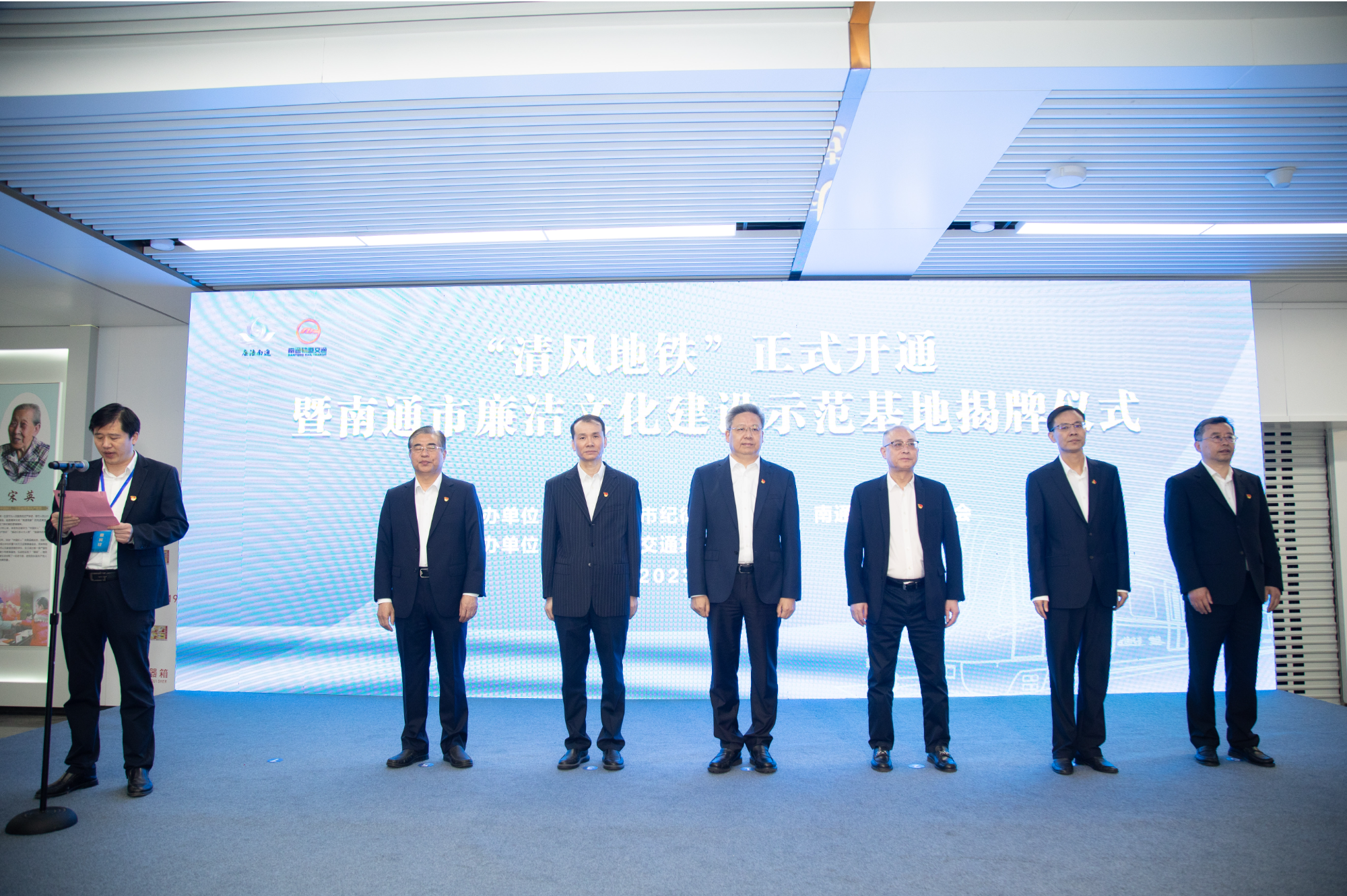 5月10日是全市第16个“5·10”思廉日。今日上午,“清风地铁”正式开通暨南通市廉洁文化建设示范基地揭牌仪式在轨道交通1号线世纪大道站地铁廉文厅举行。市委书记吴新明,市人大常委会副主任、党组副书记庄中秋,市委常委、市纪委书记、市监委主任姜东,副市长童剑,市政协党组成员、副主席金元,市中级人民法院党组书记、院长刘坤出席仪式。市纪委副书记、市监委副主任姚胜主持仪式。
